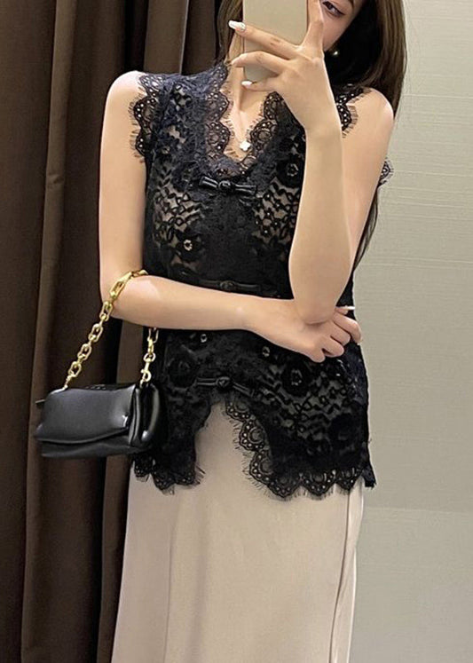 Slim Fit Black Hollow Out Lace Vest Sleeveless VB1068
