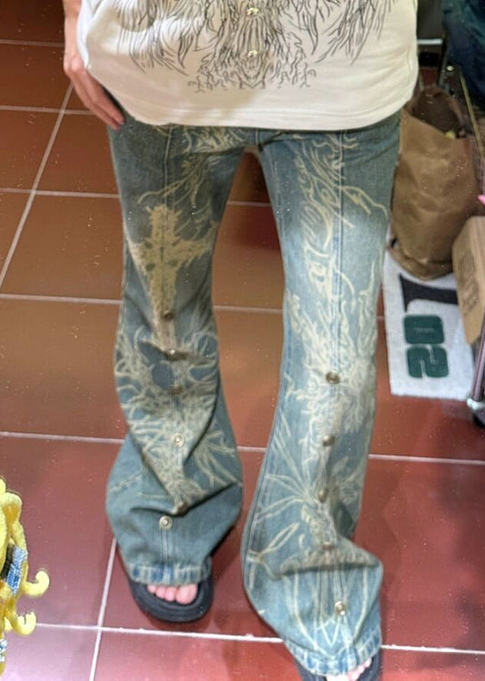 Slim Fit Blue Print Nail Bead Denim Flared Trousers Fall QF047