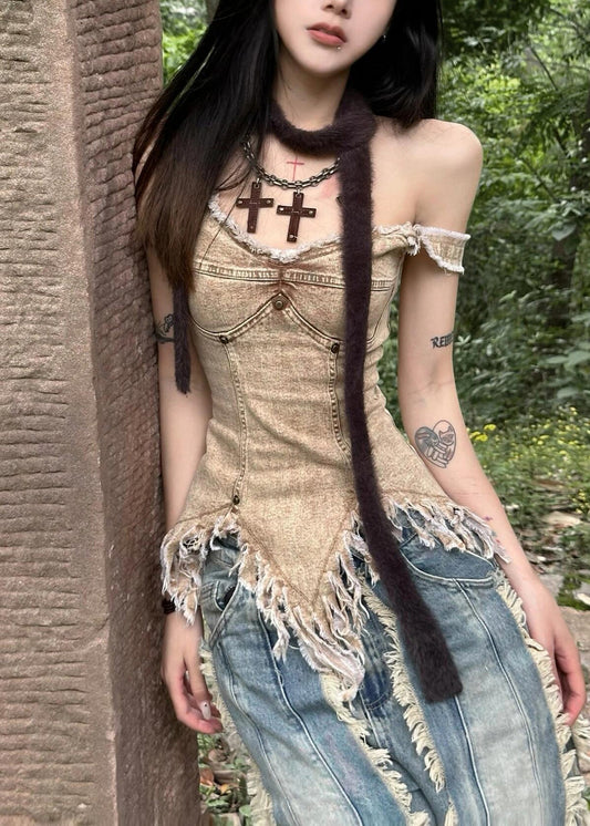 Slim Fit Khaki V Neck Asymmetrical Denim Tank Sleeveless PP034
