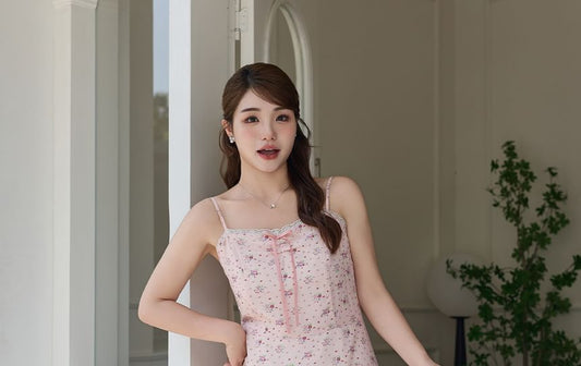 Spaghetti Strap Floral Bow Ruffle Trim A-Line Sundress