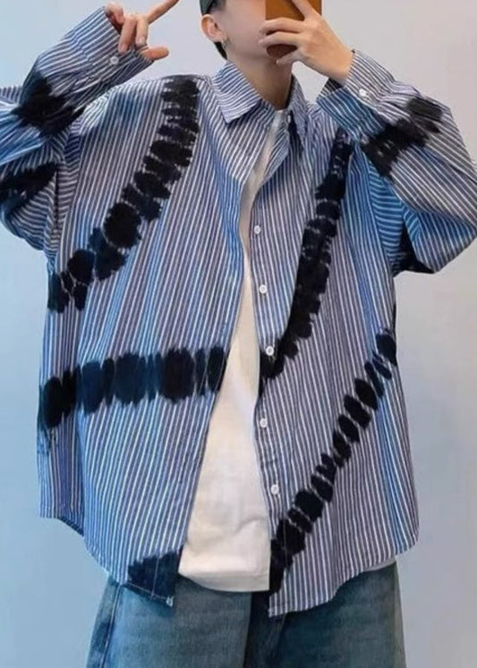 Spring Blue Men Shirts Tie Striped Cotton Dye Chic