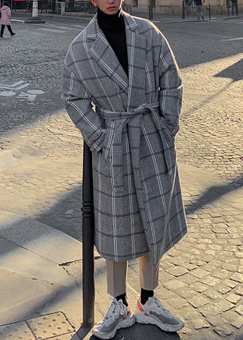 Stylish Coffee Plaid Notched Tie Waist Woolen Mens Coats Winter RO040