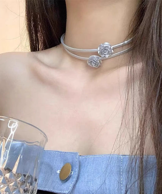 Unique Silk Sterling Silver Rose Bilayer Choker PO060