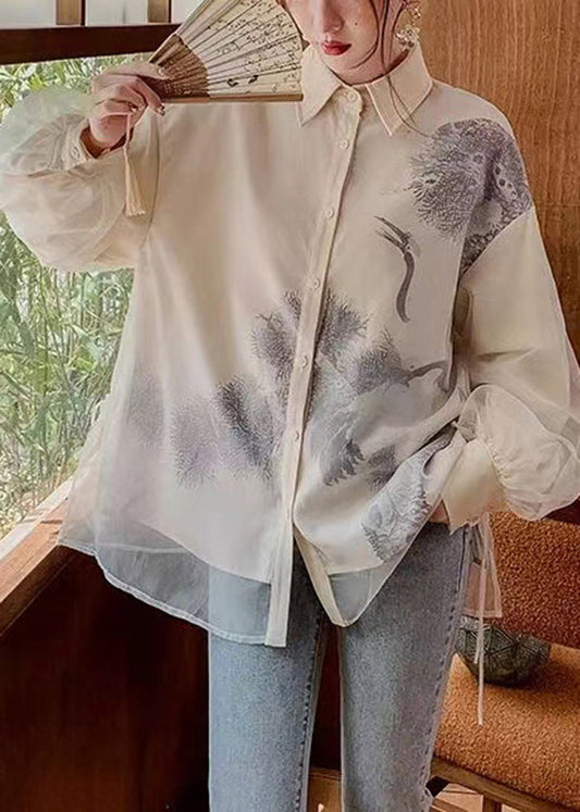Vintage Black Peter Pan Collar Print Tulle Patchwork Silk Shirts Long Sleeve BV062
