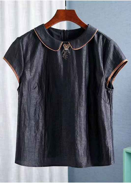 Vintage Black Peter Pan Collar Embroideried Silk Tops Summer AH526