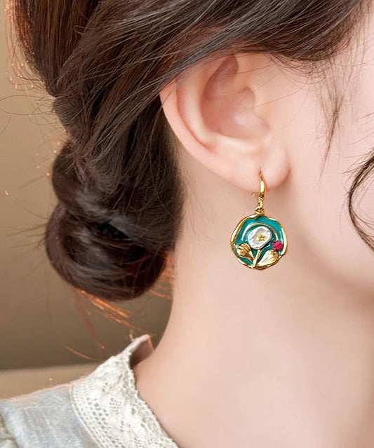 Vintage Gold Copper Overgild Ceramics Floral Hoop Earrings QU047