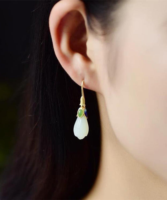 Vintage Gold Sterling Silver Overgild Inlaid Jade Tassel Drop Earrings KX1011