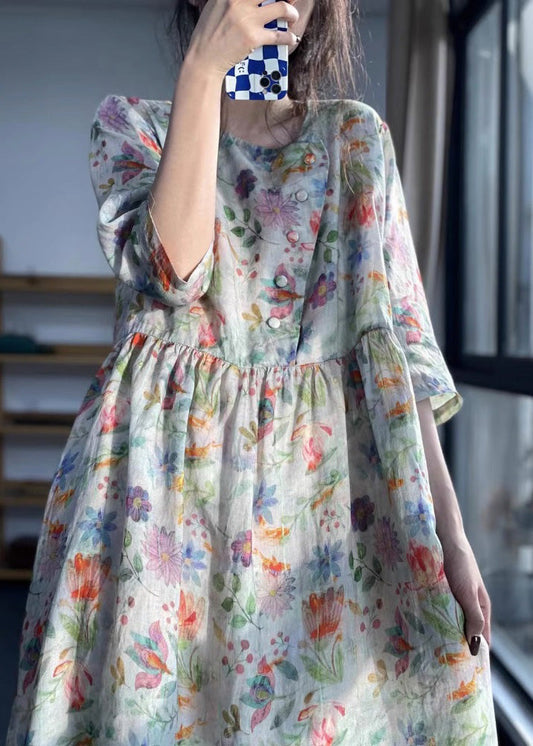 Vintage Light Purple V Neck Print Linen Dress Summer SD1023
