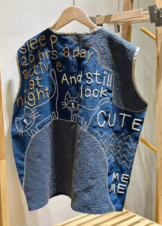 Vintage Navy Embroideried Sleeveless Linen Vest Beach