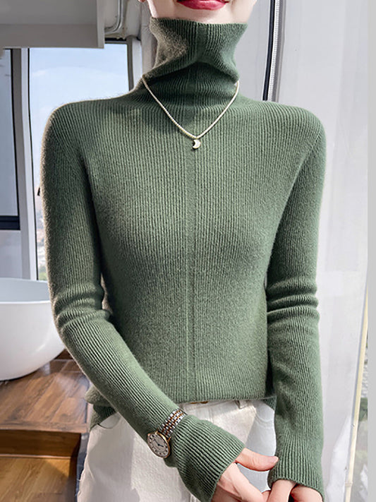 Women Autumn Casual Turtleneck Solid 100%Wool Sweater QU012
