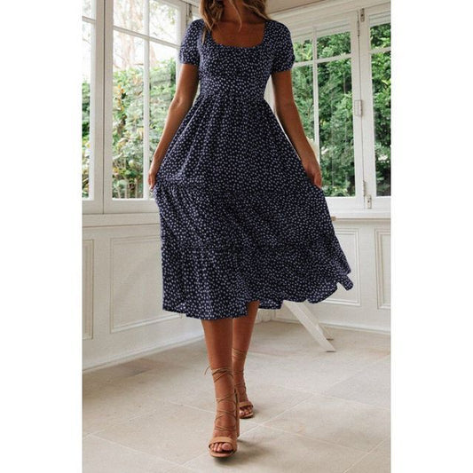 Short-Sleeve Square-Neck Floral Print Midi A-Line Smock Dress YS1003