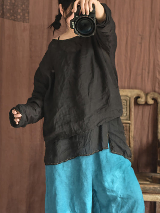 Plus Size Women Autumn O-Neck 100%Linen Loose Blouse AK1001