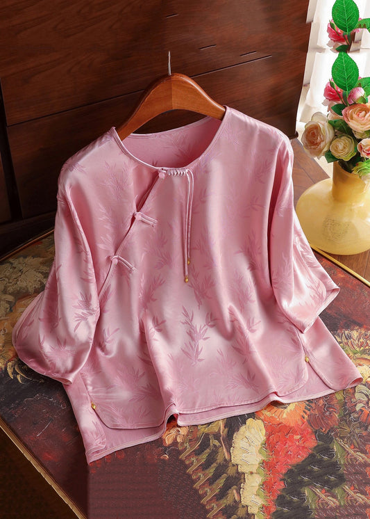 Women Pink Stand Collar Side Open Linen Blouses Half Sleeve GG017