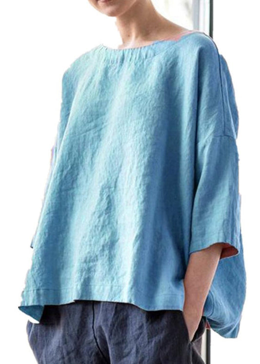 Vintage Blue Button Print Linen Blouse Half Sleeve GG038