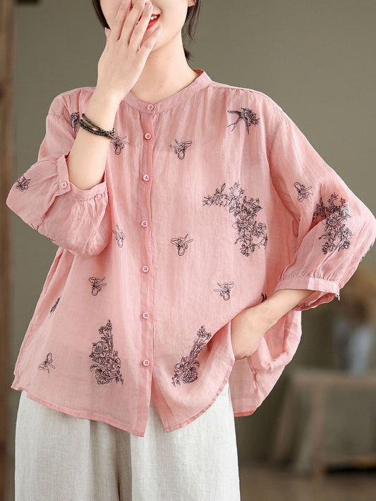 Women Ethnic Flower Jacquard Button-up Ramie Blouse SC1023