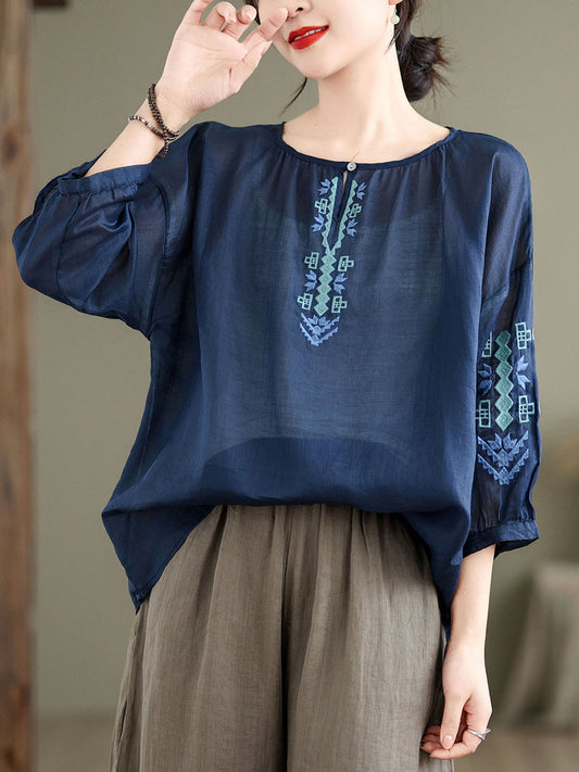 Women Artsy Summer Embroidery O-Neck Ramie Blouse KL1019