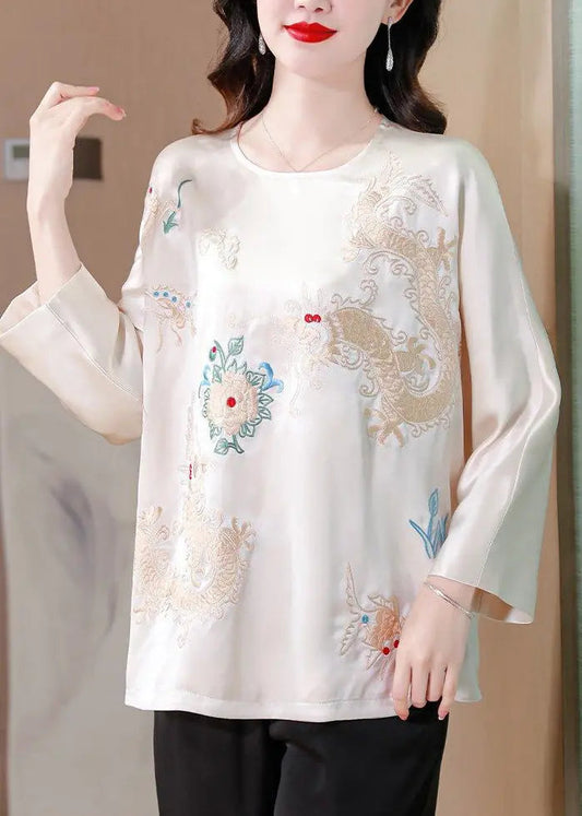 White Draping Silk Blouses Embroidered Spring HA1020