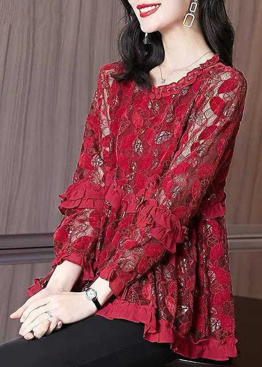Chocolate Hollow Out Lace Blouse Tops Ruffled Spring HA1062