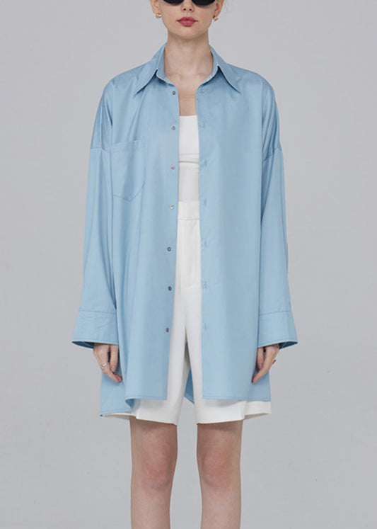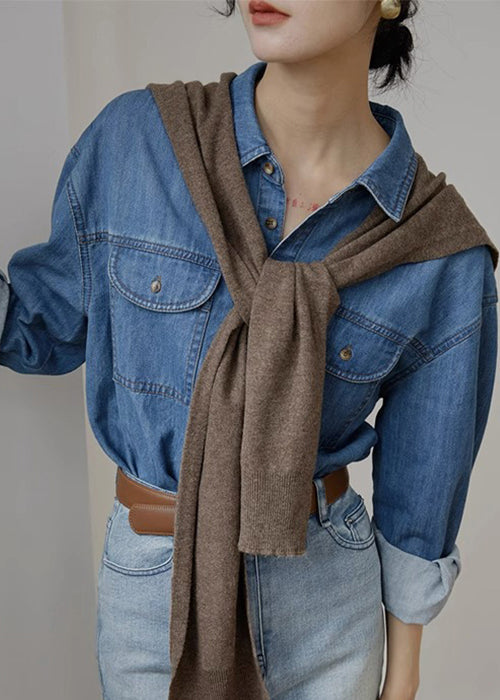 Plus Size Blue Button Pockets Patchwork Cotton Blouses Fall TU015