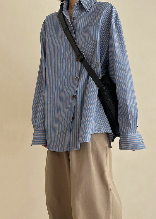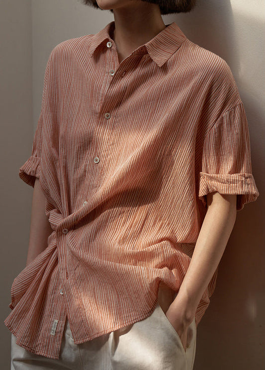 Women Apricot Striped Button Patchwork Cotton Blouse Fall TU030