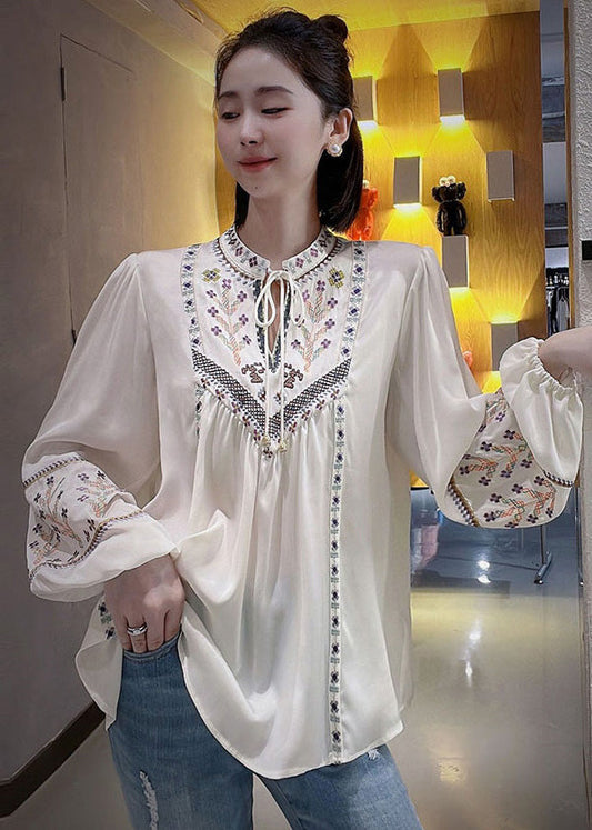 Retro Black Embroideried Lace Up Silk Blouse Tops Long Sleeve LY7716