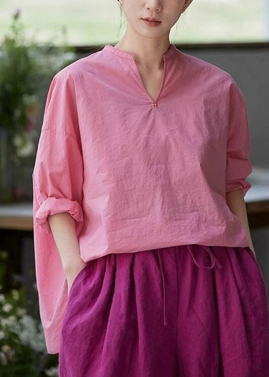 Blouses Neck Plus Open Solid Size Cotton Pink V Side Fall