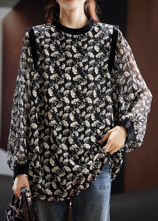 Stylish Black Fall Print Blouse Chiffon O Neck
