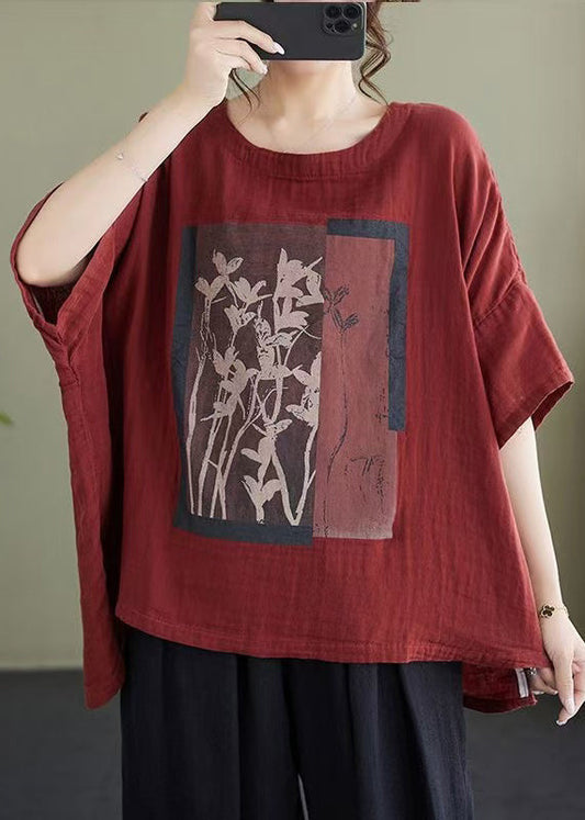 Summer Red Beautiful Linen Blouses Oversized Pockets