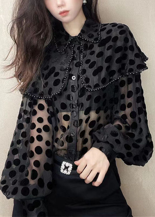 Patchwork Black Unique Velour Blouses Nail Collar Pan Bead Peter
