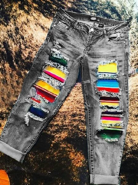 Blue Boho Stripes Ripped Denim Jeans BB16
