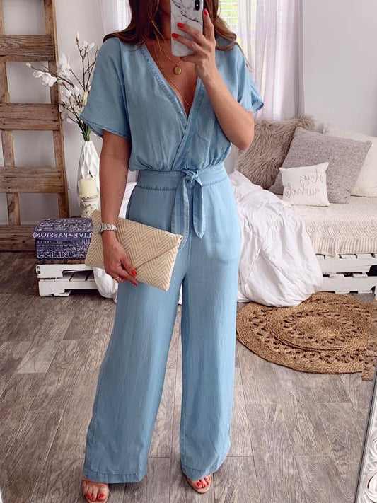 Solid Short Sleeve Casual Romper Jumpsuit wide leg pants CM91