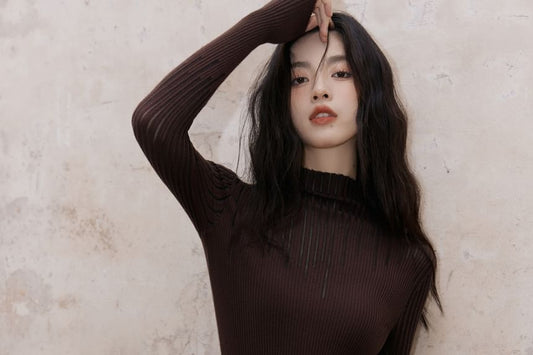 Long Sleeve Mock Neck Plain Ribbed Knit Top / V-Neck Floral Embroidered Button Vest / High Rise Plain Lace Maxi A-Line Skirt / Set
