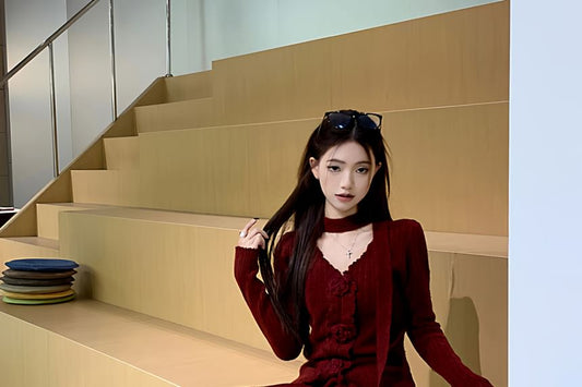 Set: Long Sleeve V-Neck Plain Floral Detail Knit Top + High Waist Maxi A-Line Skirt