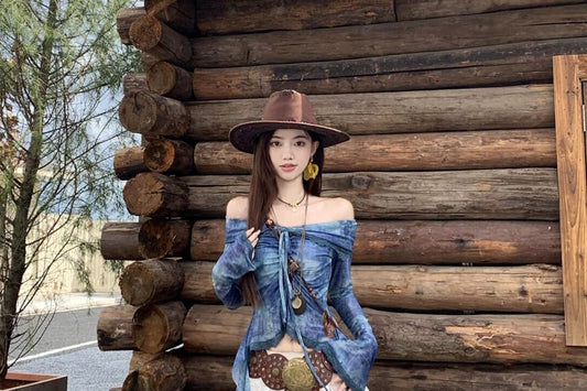 Long-Sleeve Crew Neck Print Crop Top / Mid Rise Plain Ruffle Midi A-Line Skirt / Belt / Set