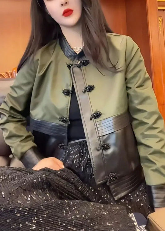 Green O-Neck Patchwork Leather Jacket
