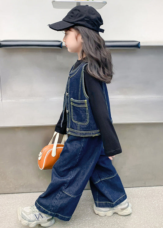 New Blue O Neck Button Patchwork Denim Girls Two Pieces Set Sleeveless ML0030