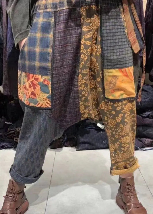 Vintage Plaid Pockets Elastic Waist Patchwork Cotton Harem Pants Fall AH123
