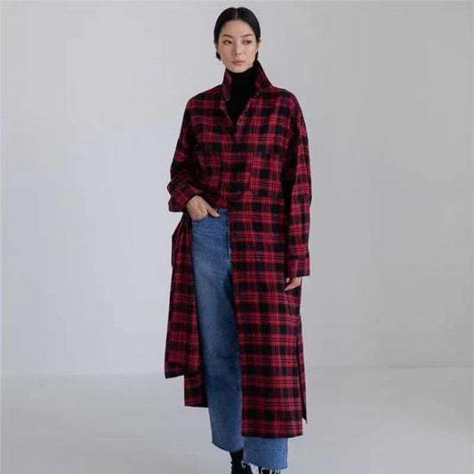 Long-Sleeve Plaid Maxi Shirt Dress AO6033