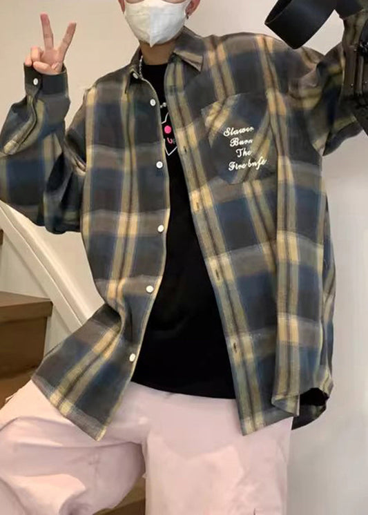 Boutique Green Peter Pan Collar Plaid Cotton Mens Shirt Fall RO006