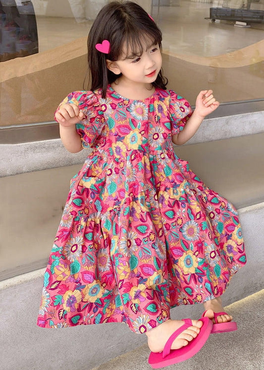 Chic Red O Neck Print Cotton Girls Long Dress Short Sleeve EW054