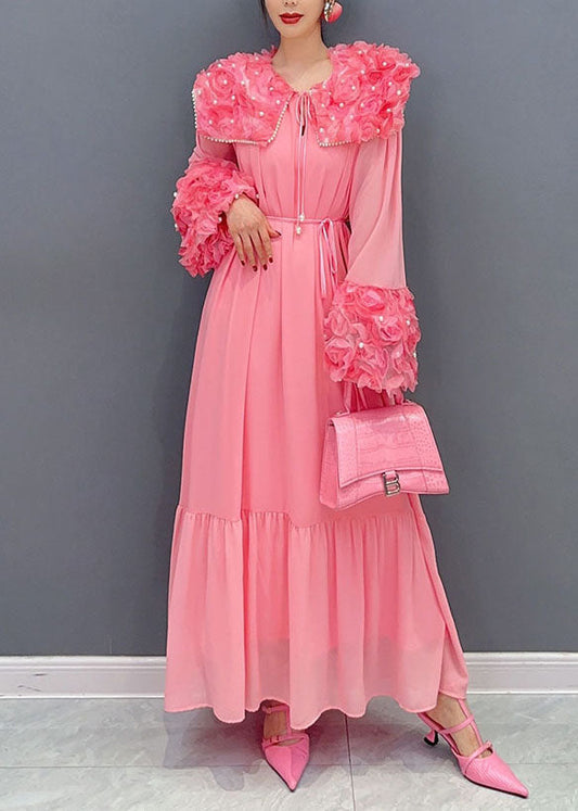 Pink Patchwork Cotton Dress Peter Pan Collar Floral Nail Bead Spring