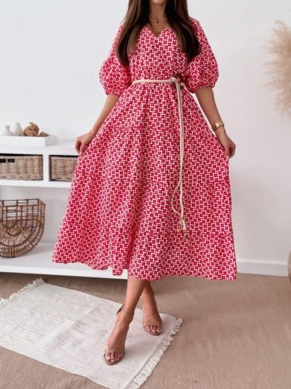 Puff-Sleeve Print V-Neck Midi Dress vb46