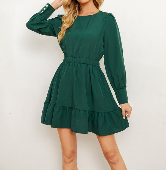 Long-Sleeve Crew Neck Plain Mini A-Line Dress vb53