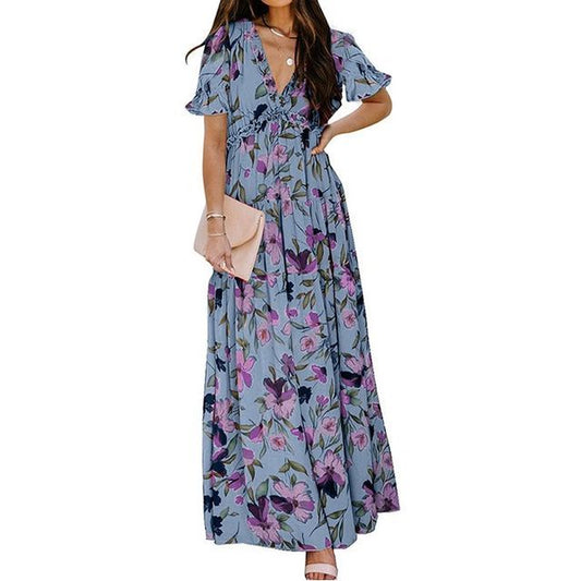 Short-Sleeve V-Neck Floral Midi A-Line Dress FR1061
