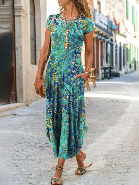 Vintage Boho Holiday Shift Ombre/tie-Dye Crew Neck Short Sleeve Weaving Dress NNq59
