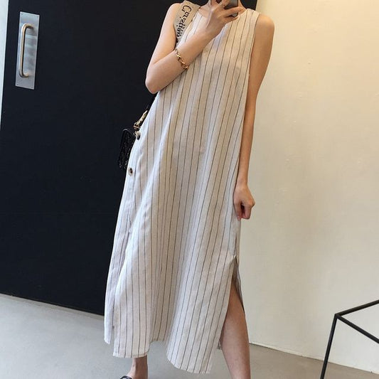 Sleeveless Striped Side-Slit Midi Sundress AO6036