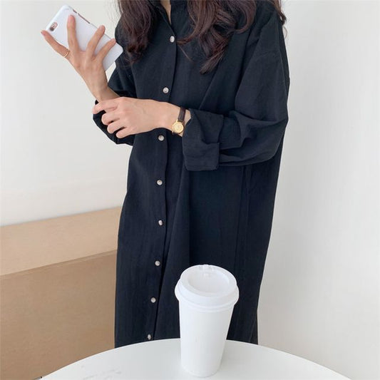 Long-Sleeve Linen Plain Midi Shirt Dress AO6035