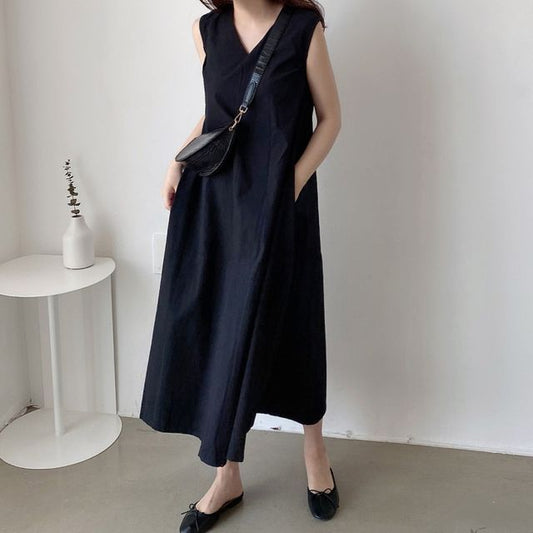Sleeveless V-Neck Plain Midi Smock Dress AO6024