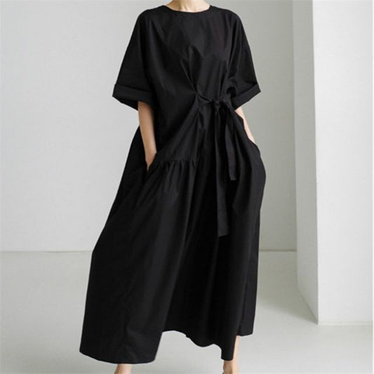 Flared-Sleeve Crew Neck Plain Tie Waist Maxi Smock Dress AH423