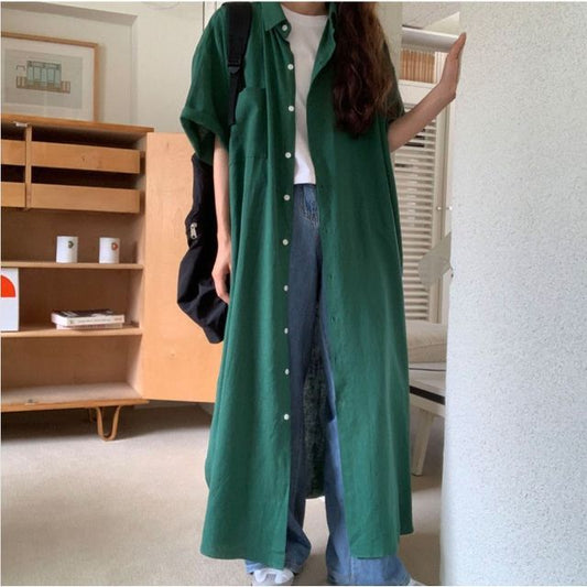 Short-Sleeve Plain Maxi Oversized Shirt Dress AO6011